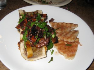 I also think they should have given us additional silverware to scoop the marrow. I used my knife which I had been using all night to scrape up sauces, oats, gizzards and whatnot. And finally, let’s talk about this crostini they gave us with the marrow. There were three triangular pieces that were rather floppy. Turns out they were smeared with tomato. Um, okay? Could that flavor be what was competing against the bitter walnuts and the strongly acidic vinaigrette?