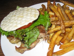 My coworker opted for the burger and I tried the chicken sandwich. Both came with odd thin white bread which was later said to be sourdough. I thought they were thin white bread pressed into a waffle-y mold. My coworker’s was well toasted but mine was rather stark white. The thinness of the bread was not much of a barrier from the heat of the chicken but I made do.