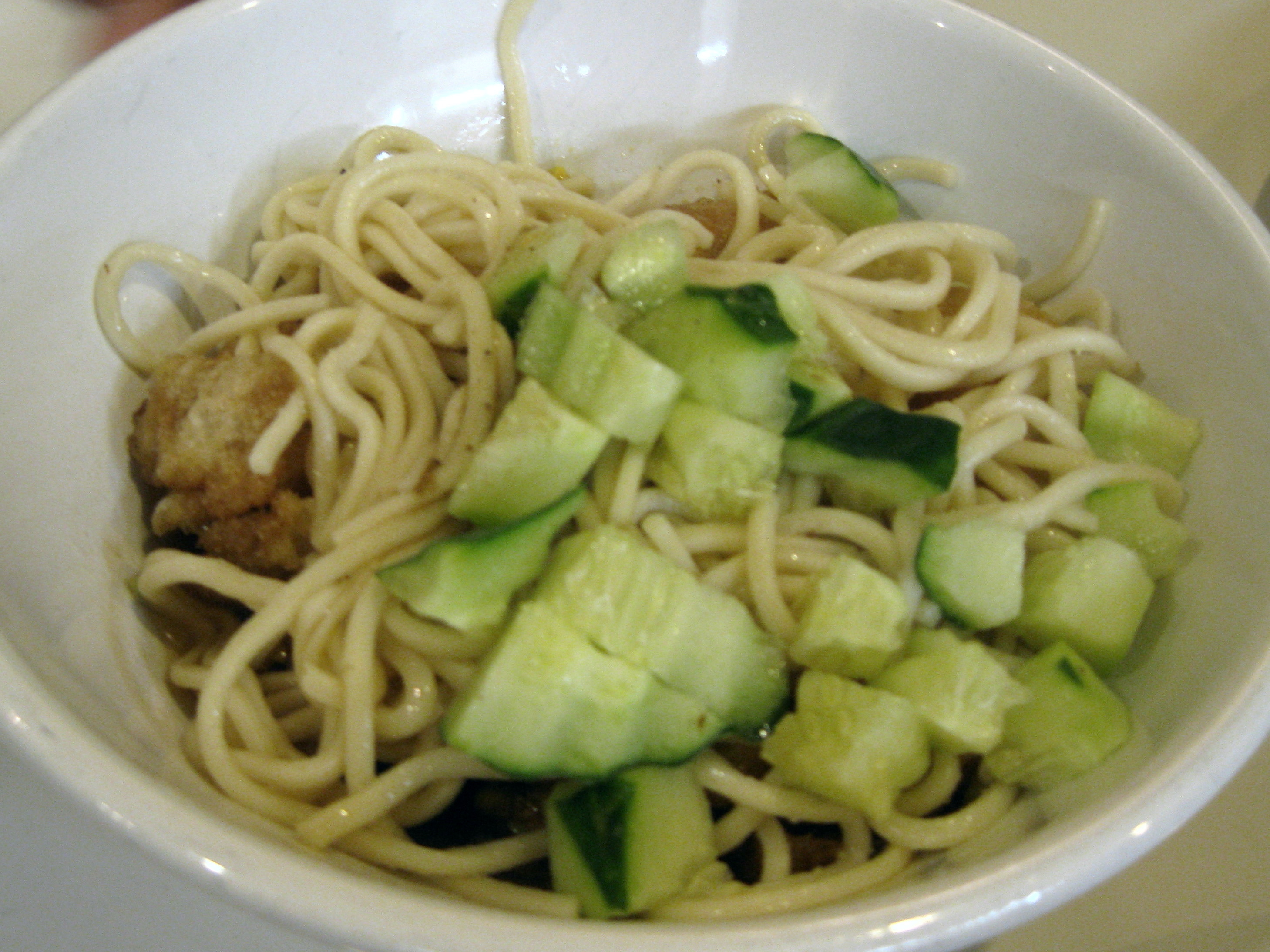 This appetizer featured a deep-fried fish patty with noodles and sliced cucumber on top. I thought it tasted fine but my noodles partner insisted it was awful and no one should try it.