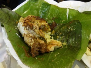 The nasi bungkus featured rice wrapped up in a banana leaf with three different toppings including curry chicken, beef rendang and veggie curry. There were also bits of chicken gizzard and the now ubiquitous egg.