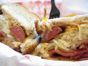 At Slaw Dogs, I tried to create a Chicago dog (all beef hot dog in a poppy-seed bun topped with mustard, onion, sweet pickle relish, tomato, sport peppers, celery salt and served with a pickle). But since they only provide up to 3 regular toppings for free, I didn’t think it was worth $.39 for each additional topping. So I went with the Reuben dog from their specialties. The dog is sliced in half and stuffed into a pastrami Reuben sandwich. Rather ingenious.
