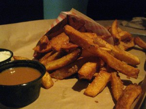 The fries are probably the most addicting fries. These are classic Belgian fries. With a large, you get a choice of two dipping sauces. I love the bleu cheese bacon and the Thai is pretty awesome as well.