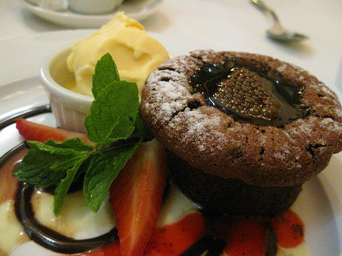 A great meal deserves a sweet ending. When the chocolate volcano was mentioned, of course we had to have it though sometimes I don’t think molten lava cakes are that great (cake can be too dry with ooey bad chocolate). But Le Saint Amour’s was le perfection. A warm moist cake served with a great vanilla ice cream and ripe strawberries.