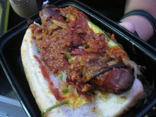 But one taste and I knew they were good. Still, I wasn’t entirely sold on this truck until I had a couple of bites of the dogs. I had a bite of the Noodles Partner’s kraut dog which I enjoyed. And the thinner chili actually worked with the dog. A chunkier chili would have detracted from the snap of the fried hot dog which was long and plump. Yowza!