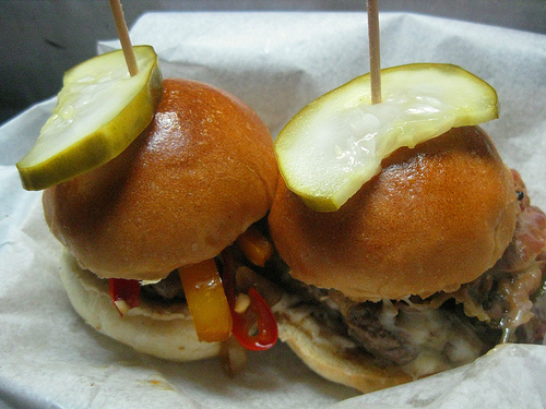 The Noodles Partner and I ordered the “You’re My Everything” (aka the sweet peppers one) and “I Get a Kick Out of You” (aka the spicy jalepeno one). She thought the peppers one was actually the spicy one and it’s a good thing I ordered the jalepeno one because we ended up switching. One bite of the spicy and I was out. I can only handle about medium spicy and this itty bitty burger immediately caused me to sweat profusely (okay, not profusely because that’d be gross). The Noodles Partner loved the spicy, of course.