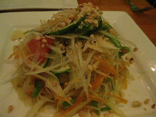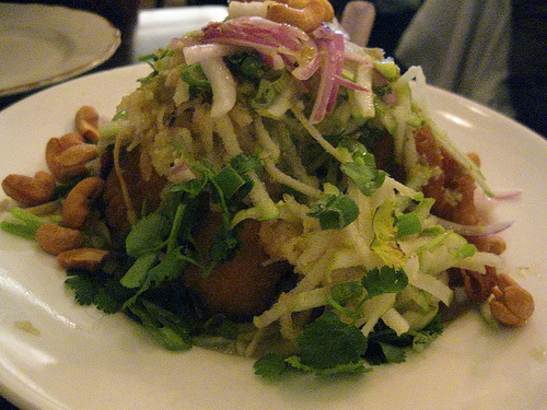When I’m at an actual Thai restaurant, I tend to order green papaya salad, angel wings, pad thai or penang curry. Yes, I know. It’s boring and surely isn’t adventurous enough for a foodie. But damnit, that’s what I like. So, I got the papaya salad at Cafe Linda. It was okay. It was missing the dried shrimp and overall wasn’t anything special.