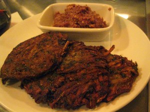 The lamb ribs were great. Very tender and I loved the hummus it came on top of. The crispy broccoli were too crispy for me but it reminded me of stuff I can make at home. The potato latkes were a bit too crispy for me as well.