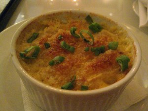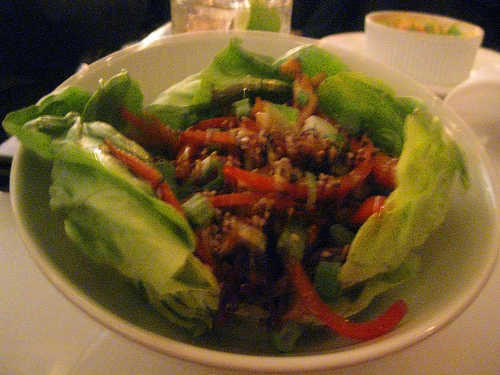 Forgive my terrible pics but the Lounge is rather dark (and somewhat uncomfortable seating as my tall self’s knees kept knocking into the strange tables). Fortunately, the lettuce wraps were pretty good. The bowl arrived with a scoop of chicken and veggies on top of four lettuce leaves that we managed to separate and serve ourselves.