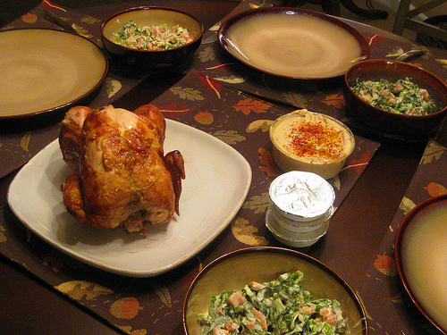 After setting the table, it very much reminded us of Thanksgiving. For those unfamiliar with Zankou, it’s Armenian rotisserie chicken. But that is not what drives me there. It’s their amazing garlic sauce. My friends and I would talk about this garlic spread and think there’s some sort of lard or butter in it. Years ago, I found a recipe on Chowhound that said it was actually pureed potatoes. Egads, really? That rich, buttery, fatty, seemingly unwholesome garlic product was actually relatively healthy (that is, unless you put it on everything).