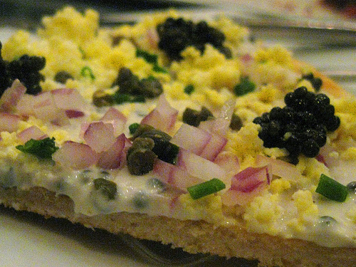Then we had the caviar pizza and steak tartare with caviar.The pizza was quite unusual, being that it was on a flatbread. I was good with one slice. I loved all the toppings. Delicious salty things like capers and caviar went well with the crumbled hard boiled egg and diced red onion.