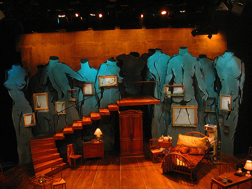 As an artist, I love details and design. The set was stunning with the huge blue bodies and most of the play centers on the sick bed where Moe was often groaning from.