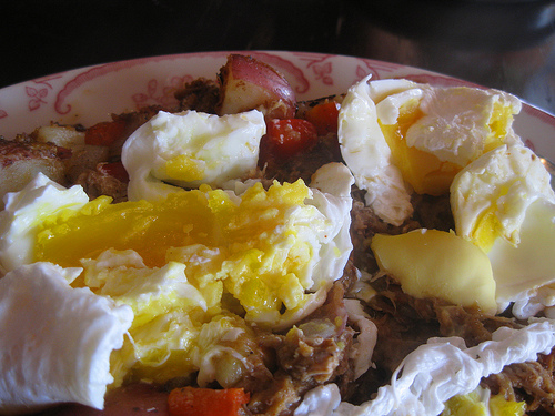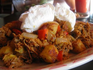 food picture: complimentary cereal, chili con queso “made it mud,” steak salad and pulled pork hash
