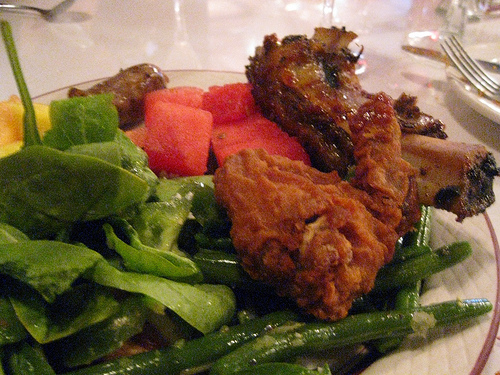 By now, I was feeling like I was missing vegetables. I filled up half a plate with salad and fruit but couldn’t resist getting a piece of fried chicken and one giant beef rib. I skipped the pasta, omelette and crepe stations. There were also some “Latin” food and I got a tamale and a couple of taquitos. The tamale wasn’t great but better than the ones I had during the tamale crawl.