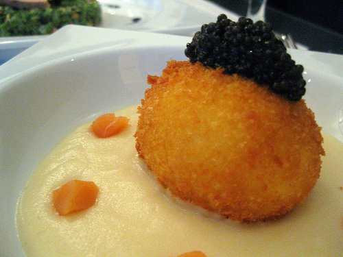 Recently, the Gastronomnom talked about Petrossian’s crispy egg in his post about food paparazzi. It stuck in my head and I hoped it would be as good as the egg in Lyonaise salad I had at Marcel Vigneron’s Hatchi dinner. It would have been an egg for the people, an egalitarian egg but it was topped with caviar so I suppose it was really more an egg for gourmands. We liked it but we preferred the sauce more and wouldn’t let the server take our empty plate because wanted more bread to sop up the creamy sauce.