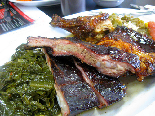 I modestly put down four places on the crawl (Bill’s Chicken, Roscoe’s Chicken and Waffles, Grand Chicken and El Pollo Unico) and we ended up only at one and it wasn’t even the one I originally planned on. Five people dropped out and the remaining 4 adults (and one baby) enjoyed juicy BBQ chicken (and ribs!) at Bonnie B’s Smokin’ Barbeque Heaven. Bonnie B’s opened about 6 months ago and replaced Bill’s Chicken (there is another Bill’s Chicken nearby on Lincoln).