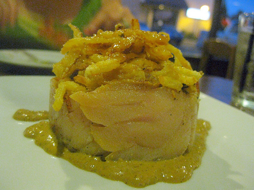 Then she ordered the strangest “roll” I’ve ever seen. I refused to eat any of it. I like onions but the mass of fried onion strings on top didn’t seem appetizing to me. Later she reported it was pretty good with the sauce.