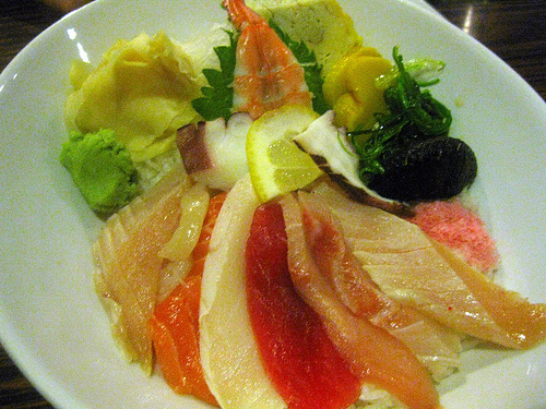 I was really torn. So far I didn’t think much of the sushi I was seeing coming from the sushi bar. I decided to play it safe and go for the chirashi bowl. The tamago was sadly greenish and I definitely didn’t like the look of the untidy pieces of fish. My rice wasn’t even seasoned properly.