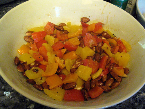 Add the bell peppers and almonds back in to the pan to toss before serving.