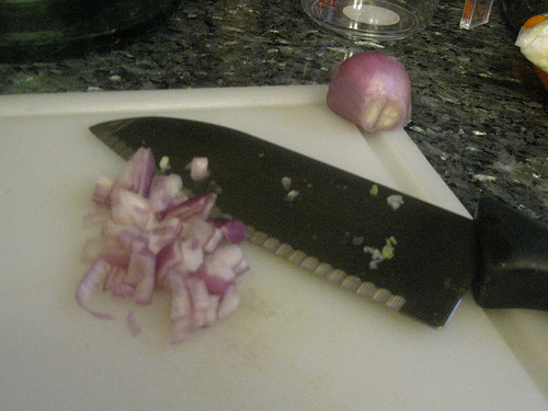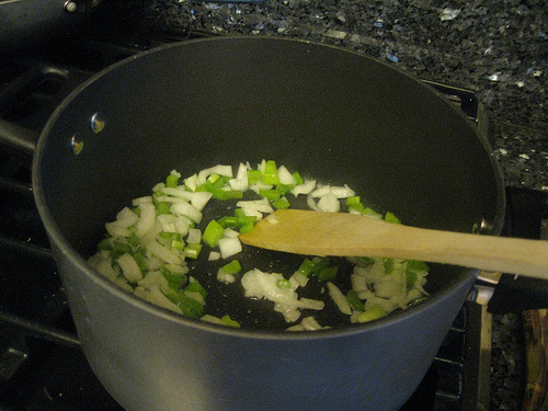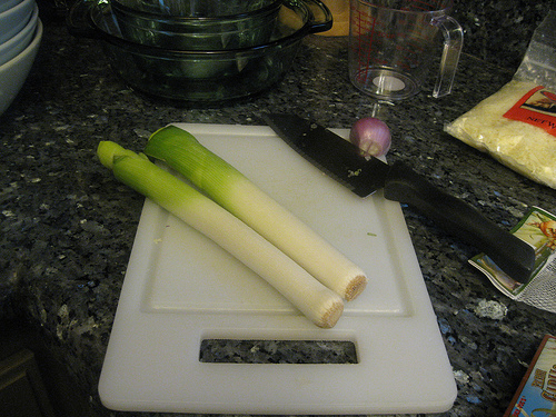 Saute a clove of garlic (add more if you like it more garlic-y or if you’re not a vampire) along with diced onions and celery. Add in diced shallots and leeks. I did one onion and four stalks of celery along with one shallot and half a stalk of leek.