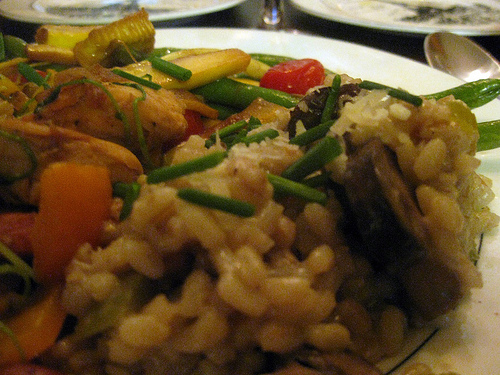 I served this risotto with chicken and vegetables. When I plated, I added a touch of grated Parmesan cheese and chives for color. I would recommend serving it right away as I noticed the rice got a bit mushy which is what you don’t want in a risotto but unfortunately I had to cook everything at once and not look harried when my guests arrived. I had this on the stove warming for a bit.