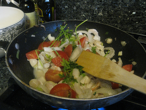 I added garlic, shallots, leeks, sliced onions, chopped heirloom tomatoes, Italian parsley and lemon juice to cook down. I didn’t defrost my seafood but it had been sitting out about an hour in the sink. Once the pan was ready, I added the seafood and removed it when the shrimp turned pink.