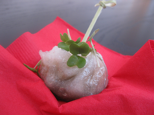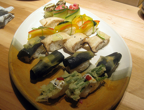 While I enjoyed my chicken wings, bacon-wrapped enoki mushrooms and a couple of pieces of sushi, I was mostly intrigued by the wide variety of veggie sushi. The “kelp” looking one turned out to be eggplant.