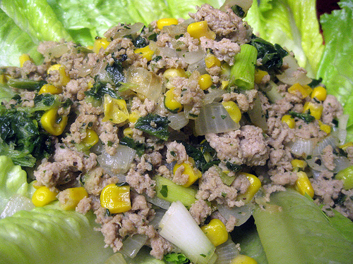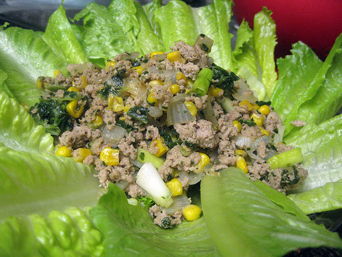 A couple of weeks ago, I found myself not very hungry but I knew I should eat a little something. I rummaged around my kitchen and came up with ground turkey and some romaine lettuce. I also had green onions, garlic and onions on hand. I decided to add a little frozen spinach and canned corn for color but you can of course substitute for anything fresh you have. I would have loved to spice it up with a little mirin but I was out of it.