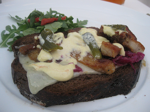 I got my greens and then I got to work on this crazy sandwich. Pork belly, creamy sauce, gruyere…are you kidding me? I hope you love lovely fatty things because this is the sandwich for you! The cornichons and pickled stuff gave it a punch and I appreciated the small side salad it came with.