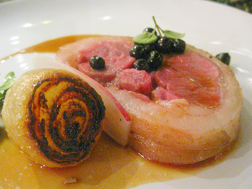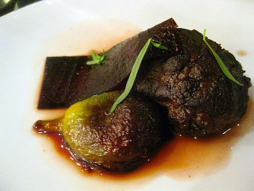 pork cheek. fig leather. glazed fig. pork cheek jus. tarragon.