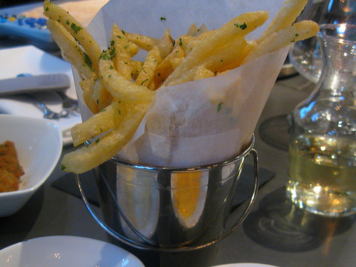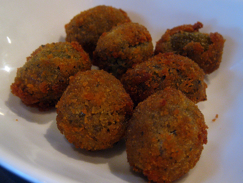 First off, they offer $3 small bites and $5 small plates as well as $4 well drinks, selected beer and wine. This is a much better deal already. The items sounded fairly interesting. We got the veal pancetta stuffed olives, truffle fries, mussels and French 0nion soup. The two of us made it out of happy hour just under $40 which translates to a $20 a piece which wasn’t bad at all since we each had two drinks.