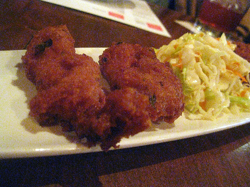 Acra is the national dish of Haiti. It’s grated taro with herring, green onion, bell pepper, onion, garlic, black pepper and parsley. It was very light and fluffy. It was served with pikliz, the cabbage and carrot slaw was flavored with habenero chile, salt, key lime juice and vinegar.