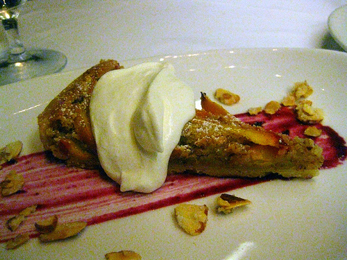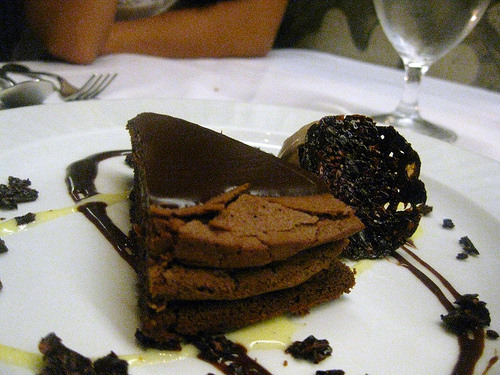 We ended the evening with two desserts; a chocolate flourless cake (something of a dying menu item) and a nectarine tarte. The cake was a bit too sweet (since when can chocolate be too sweet?) but I loved the tarte. It was the perfect end of the meal and with a bit of a wistful goodbye to summer stone fruit.