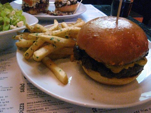Knowing I was going to probably order a burger, I opted for the chop salad. The seemingly Greek salad had this odd honey-mustard-ish dressing. They said it was a red wine vinaigrette but I didn’t detect red wine.