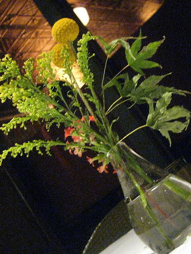 The sashimi this evening was hamachi. My friend discovered the flowers weren’t too tasty but she liked the fish. My pork belly was fine. I liked the tart garnish on top.