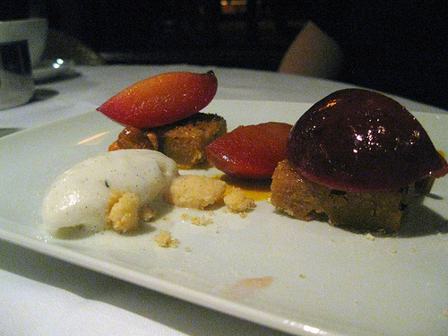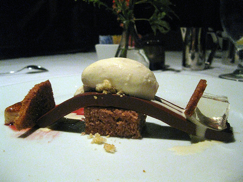 Gosh, I loved my little chocolate bridge. It was so adorable and that clear cube was like a shot of pure booze. The gelee was creme de cacao (ah, the ingredient for a chocolate cake shot!). In any case, this was a great dessert and the most inventive thing. The flexible chocolate ganache as a bridge! The ice cream melted a bit and created “tracks” on the bridge. It was just so dandy and great plating.