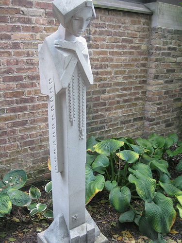 FLW acknowledges a few influences in his life including Japanese art. This statue was outside his first home he designed.** side note, I was on the Prairie School Traveler site and noticed Midway Gardens, this demolished FLW building, featured these Japanese ladies. While on the tour, we were shown how Louis Sullivan whom FLW looked up influenced him. Some of the stuff we saw in Wright’s home were things he was working on for Sullivan including ornamental touches found at the Ambassador.