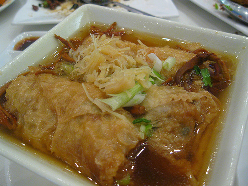 The bean curd wrapped veggies turned out to be a mini-soup with dried shredded scallops as a garnish. These were great and probably the most version of this dish I’ve had before.