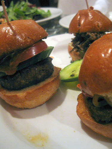 We ordered everything on the menu; heirloom tomato bruschetta, olive oil poached tuna salad, slow roasted salmon salad, ceviche, both skewers (tofu/ butternut squash and beef) as well as sliders. For the sliders, you had a choice of grain/nut (with wheat bun), moroccan lamb, bbq short ribs, turkey or beef.