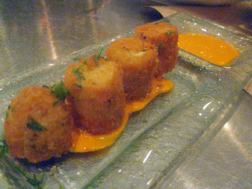 Ah, you know you’re in a fancy pants place when the equivalent of a large crab cake is divided into tiny bites. Save on calories but big on flavor.