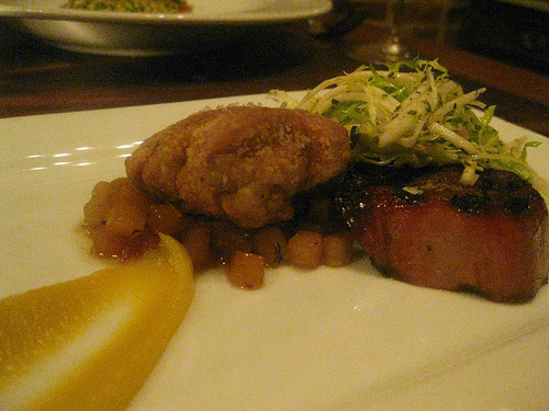 After starting with a simple romaine salad (not pictured), I had the sweetbreads and veal tongue while Carina got the uni risotto. I’ve been on a sweetbreads and tongue kick and how perfect they were served together. Carina’s been on a uni risotto kick (yes, really!) and we decided the little roe in her dish were nature’s pop rocks.
