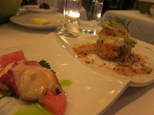 Chef Kevin mentioned the Duo of the Sea, our appetizers were among the kitchen’s favorite dishes. You never know what fresh seafood they have on hand and it was a joy to discover the octopus was quite tender. The slightly bitter ruby red grapefruit went well with this dish. On the other hand, the salmon was more traditional with dill and creme fraiche. The addition of the roe was whimsical and a nod to the Cal side of this Cal-French restaurant.