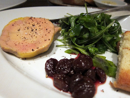 The six-course tasting was served in pairs. First we got the Hudson Valley foie gras terrine. It was served with a plum marmalade, housemade (buttery!) brioche and a small mound of arugula. I quite enjoyed this but we eventually had to leave some foie behind (I know!) because our next courses were coming and we were getting full.
