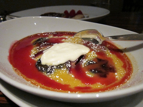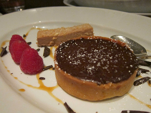 We ended with a cherry clafoutis and chocolate pie. The clafoutis was unlike any I’ve had before. Neither of us liked it. We stuck mostly with the chocolate pie. It was familiar and I liked the praline bar and roasted hazelnuts.