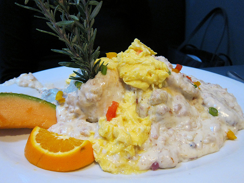 My friend had the craziest looking biscuits and gravy I’ve ever seen. The two biscuits top a huge mound of mashed potatoes and the whole thing is topped with eggs anyway you want ’em (she got them soft scrambled) and sausage gravy. She made a tiny dent in it before declaring they won.