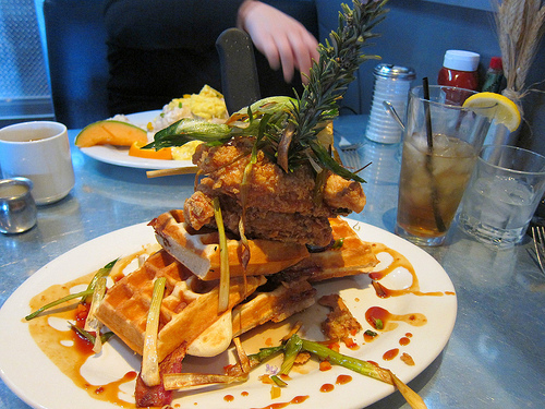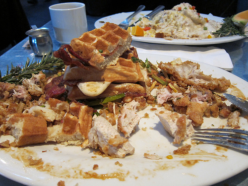 I waged a decent war with my food. My friend ate half of a waffle and I had one. You can’t really tell but I also busted the chicken out of its fried skin (I don’t know why I love fried chicken so much when I don’t enjoy skin– I usually take it off).