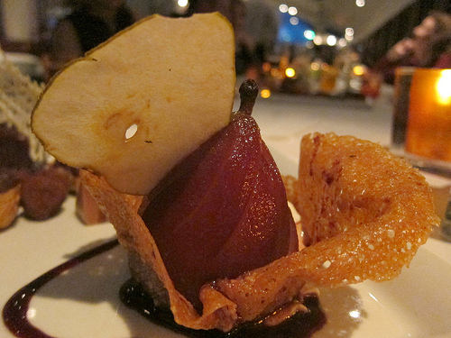 We were left to devour an enormous dessert platter. I enjoyed the port-poached pear the best. It was just so pretty and I loved the chip of dried pear sticking out of it.