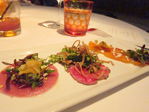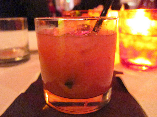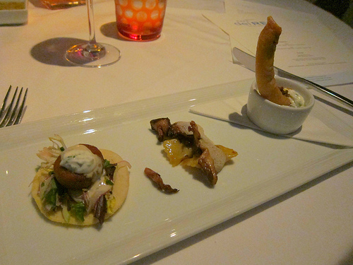 The Pomegranate Hum (10 Cane rum, pom seeds, fresh pom juice, orange juice, hum botanical) was the first cocktail I tried. I didn’t know what hum botanical was but it’s used much like bitters. It tasted like hibiscus or a spiked jamaica to me. On its own, it’s strong stuff but carefully blended in this cocktail, it was a tasty beverage. I was also intrigued by the Spiced Apple Bourbon (Woodford Reserve, spiced apple cider simple syrup, ginger ale). The would-be heavy cocktail was lightened by the ginger ale. I was going to get a Kiwi Mojito (infused kiwi 10 Cane rum, rosemary mint syrup, fresh mint, lime) but unfortunately they were out of kiwi. I got a strawberry one (not listed on the menu) instead. It was lighter on the mint than expected. I also tasted the California 75 (Hendrick’s gin, St. Germain, lime, sparkling wine) which was a really nice riff on a French 75.