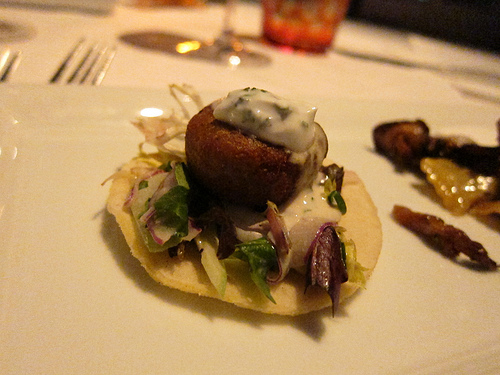 When I first looked at our special tasting menu, I didn’t realize we were going to get everything. The cold apps went down just fine and then I took a moment to savor the artfulness of the hot appetizers. The tiny falafel which isn’t quite made in the traditional way. Chef Roberts said he wanted more flavorful falafel and there’s no fault to that reasoning. We also enjoyed wild mushroom angnolotti and the kafta cigar. Kafta, or the more familar spelling, kefta is a spiced ground meat– usually beef or lamb. The chef had rolled these up in the whisper-thin pastry shell and created a cigar. These were fun to eat!