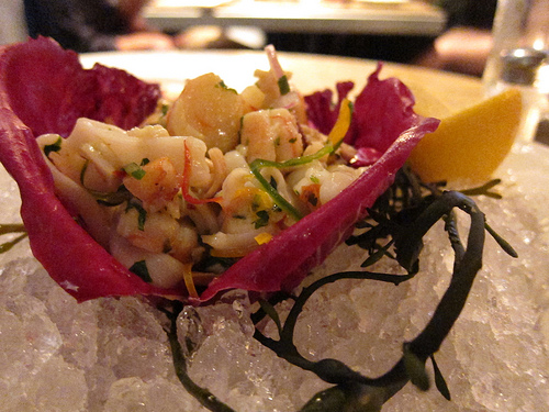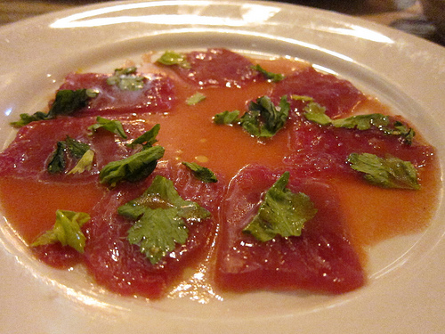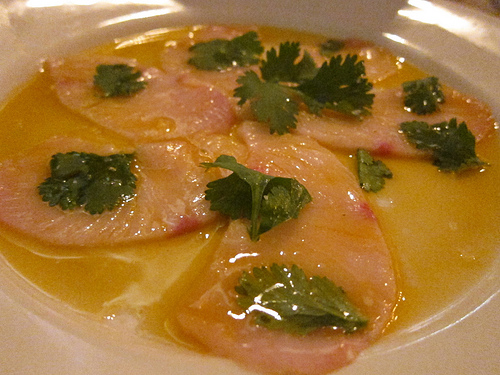 We were invited to stay for dinner. Delphine’s Executive Chef Sascha Lyon recently changed the brasserie style menu to a more sophisticated menu to take advantage of the seasons. The two-page menu offers a raw bar along with the Chef’s specials as well the restaurant’s favorites. We decided to try the new crudos. The yellowtail featured cilantro chili oil and kaffir lime salt. Our favorite, the tuna was flavored with blood orange and basil salt.