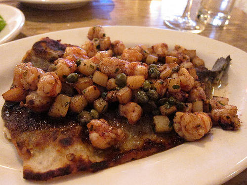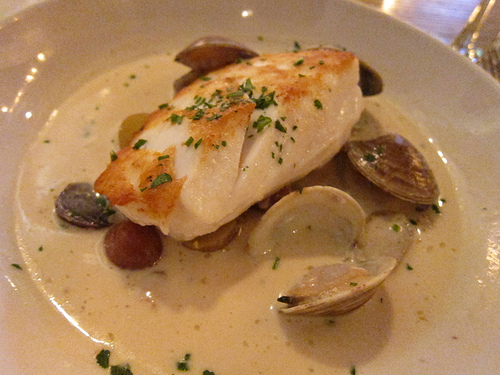 One of the specials of the week was the pan-roasted halibut with peewee potatoes and bacon clam chowder. I loved that the clams were still in the shell. Very artful plating. I had the Trout Meunier which was topped with tons of sauteed shrimp and diced potatoes.